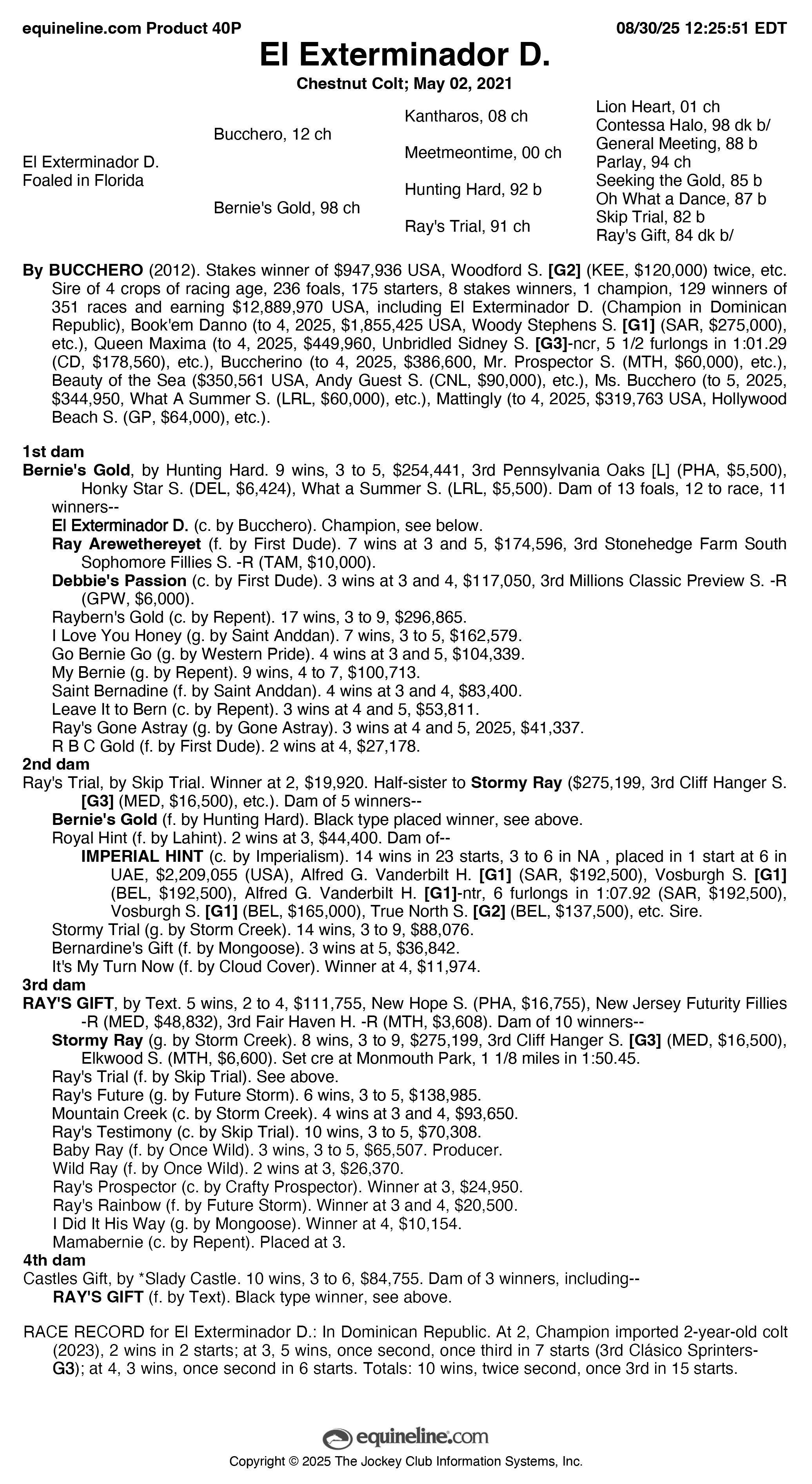 RACE RECORD for El Exterminador D.: In Dominican Republic. At 2, Champion imported 2-year-old colt (2023), 2 wins in 2 starts;